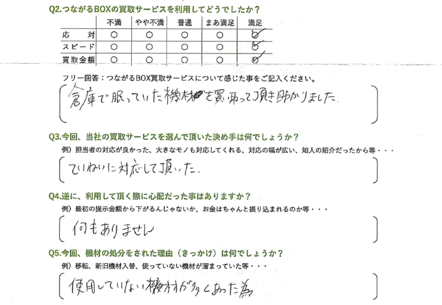 何もありません。倉庫で眠っていた機材を買い取っていただき助かりました。丁寧に対応していただいた。