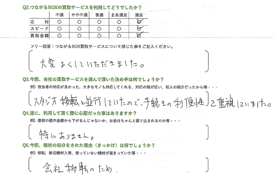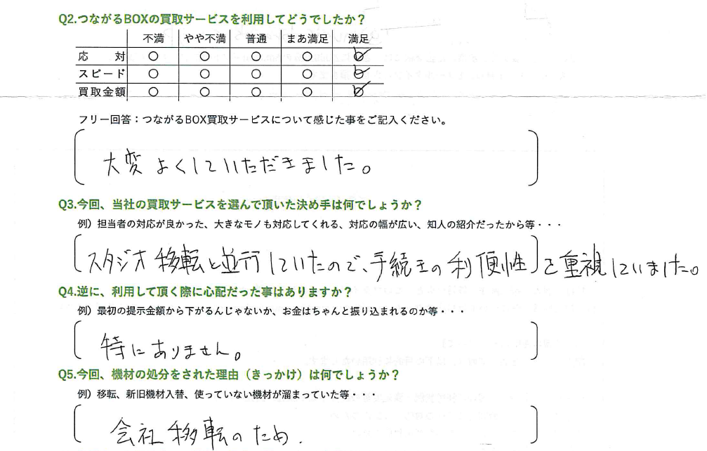 お引越しというご多忙の中、引き取り機材変更のご連絡のやりとりや、お客様のご都合でしたが、二度にわたりお引き取りに伺わせていただきましたが、最後までご丁寧にご対応いただき、誠にありがとうございました。