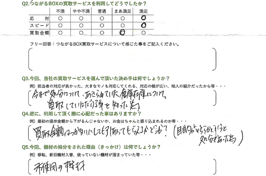 未使用の機材や、今まで処分について、諦めていた倉庫在庫について、買取していただける事を知った為。